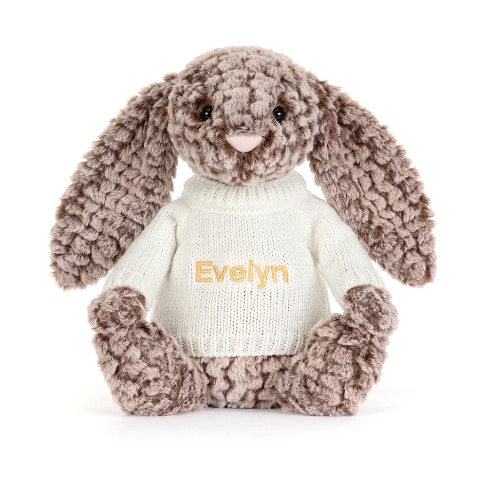 Bashful Luxe Bunny Pine is a luxuriously soft beloved Jellycat and can now be made extra special with a personalized cream jumper! With a choice of fonts and thread colors, your bunny can truly be one of a kind!