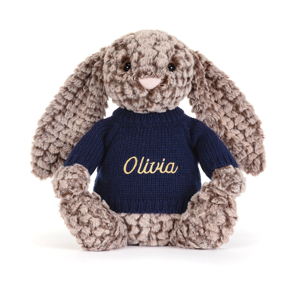 Bashful Luxe Bunny Pine is a luxuriously soft beloved Jellycat and can now be made extra special with a personalized navy jumper! With a choice of fonts and thread colors, your bunny can truly be one of a kind!